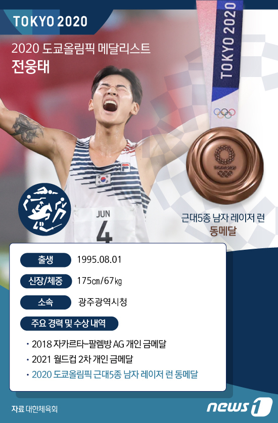 전웅태는 7일 도쿄 스타디움에서 열린 2020 도쿄올림픽 남자 근대5종에 출전해 값진 동메달을 목에 걸었다. 5개 종목 합계 1470점을 따내며 당당히 3위에 올랐다. 전웅태와 마찬가지로 한국 선수로는 정진화(32·LH)가 1466점으로 선전하며 최종 4위에 이름을 올렸다.