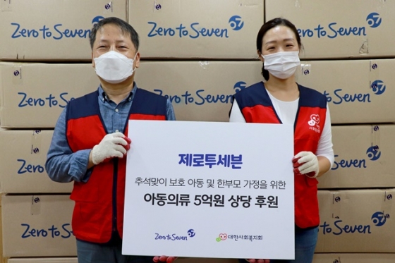 유아동 전문기업 제로투세븐(대표 김정민·이충하)이 추석을 앞두고 보호가 필요한 아이들과 한부모가정을 위해 17일 대한사회복지회(회장 김석현)에 아동의류 및 잡화 5억원 상당(시가)을 후원했다고 복지회가 밝혔다.