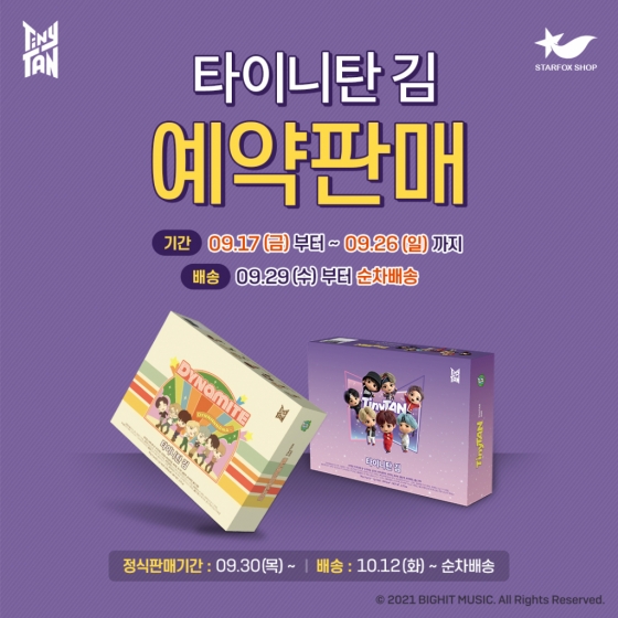 스타폭스패밀리(대표 이대희)는 HYBE(대표 박지원)와 라이선싱 계약한 방탄소년단 캐릭터 '타이니탄'(TinyTAN)을 활용한 '타이니탄 김'(TinyTAN GIM)을 9월 17일부터 예약판매 (9월 17일~26일) 한다고 밝혔다.