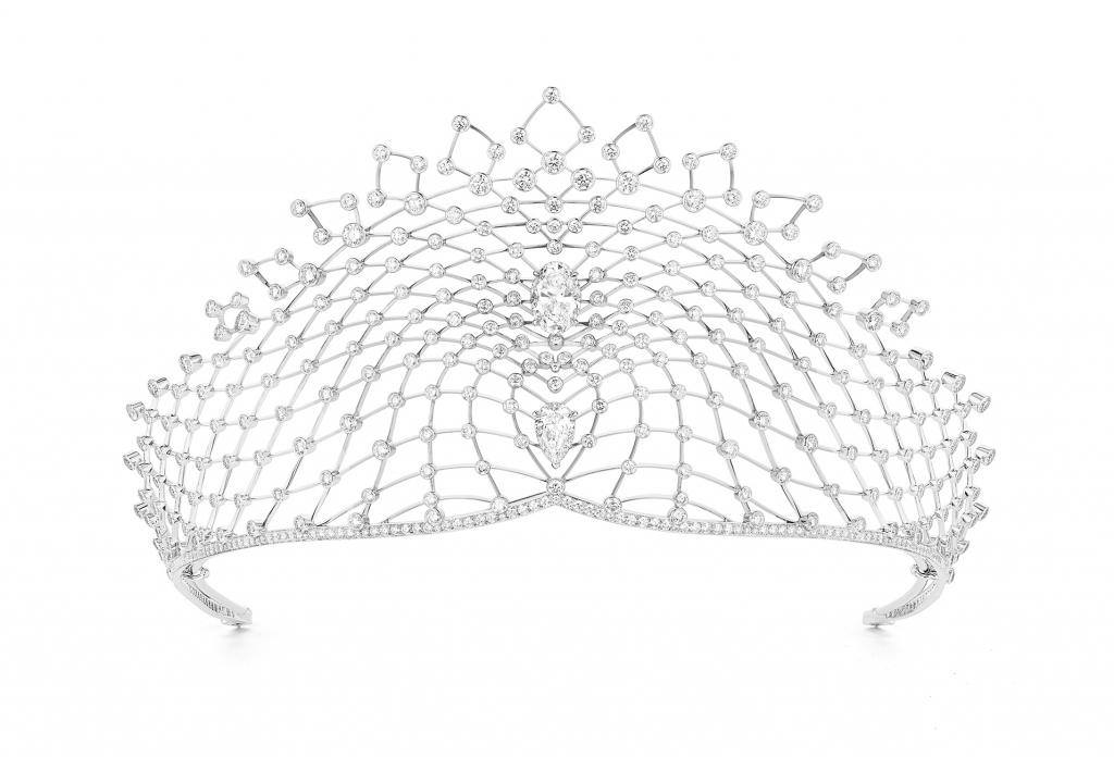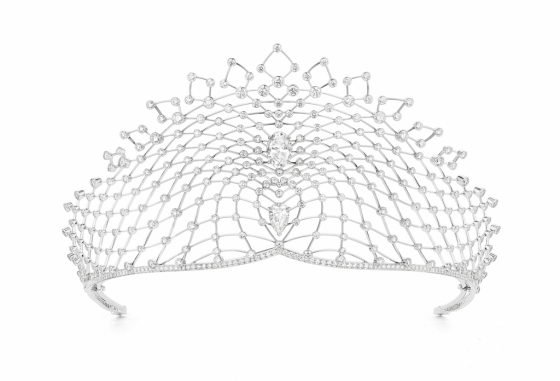 빅토리아 로마노프나 베타리니가 착용한 이번 하이 주얼리는 독보적인 투명함을 가진 2개의 다이아몬드(D VVS1 5.02 캐럿의 오벌 컷 다이아몬드 & D VVS2 2.21 캐럿의 페어 컷 다이아몬드)가 세팅되었으며, 그 주위를 총 27.03 캐럿의 438개의 파베 다이아몬드가 광채를 더하며 둘러싼다. 화이트 골드 메쉬 디자인은 쇼메 메종만의 필 쿠토 기법으로 제작되어, 마치 공중 위에 다이아몬드가 떠있는 듯한 모양을 보여준다.