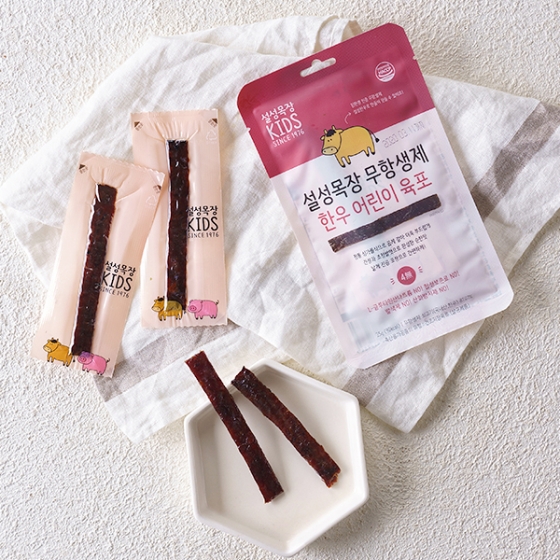 설성목장 한우 어린이 육포는 무항생제 한우를 정통 싱가폴식으로 곱게 갈아 참나무 숯에 훈연하는 방식으로 2번 구어 은은한 숯향을 느낄 수 있는 제품이다. 첨가물을 넣지 않고 간장과 조청쌀엿으로 완성한 순한 맛이라는 점을 어필하고 있다.