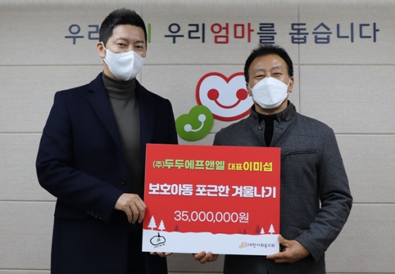 프리미엄 유아동 의류 및 화장품 제조업체 ㈜두두에프앤엘 이미섭 대표가 보호시설 등에서 생활 중인 아이들의 따뜻하고 포근한 겨울나기 지원을 위해 2일 대한사회복지회(회장 김석현)에 3500만원을 기부했다고 복지회가 밝혔다.