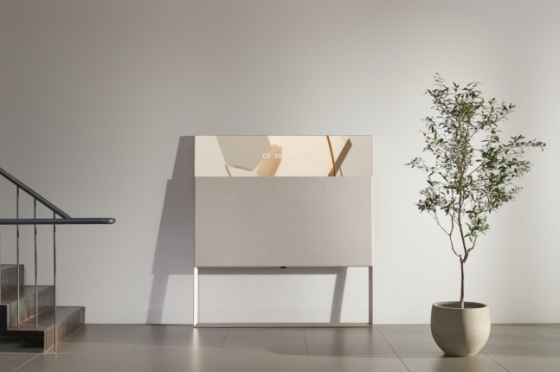 네모난 이젤(easel·그림을 그릴 때 캔버스를 놓는 틀) 형태 메탈 프레임에 65형(대각선 길이 약 163㎝) 크기로, 벽에 기대거나 밀착시키는 형태로 설치해 차별화된 공간을 연출할 수 있다.