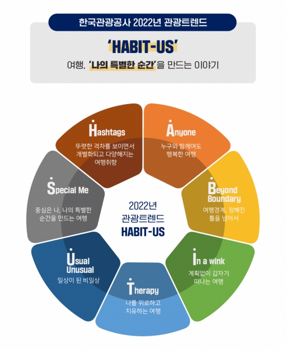2022년도 국내관광 트렌드로 제시된 '해빗-어스(H.A.B.I.T.-.U.S.)'는 취향이나 습관처럼 '스스로를 정의하는 근본적이고 내재적인 태도'를 뜻하는 아비투스(Habitus)에서 차용한 것으로, △개별화·다양화(Hashtags) △누구와 함께라도(Anyone), △경계를 넘어(Beyond Boundary), △즉흥여행(In a Wink), △나를 위로하고 치유하는(Therapy), △일상이 된 비일상(Usual Unusual), △나의 특별한 순간(Special me)까지 7개 키워드로 요약된다.