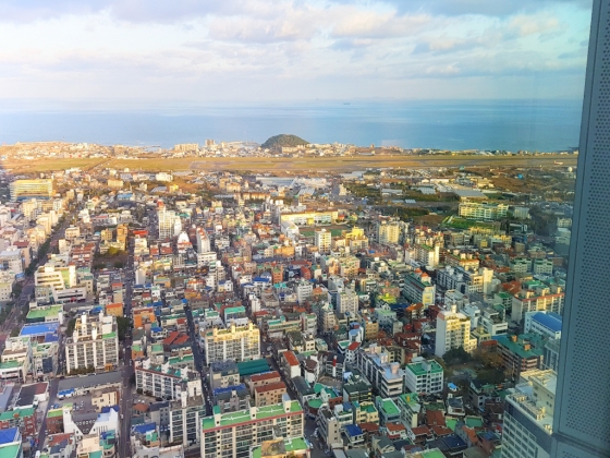 역시 모든 객실은 8층에서 38층까지 1600개로 구성되어 위치에 따라 다양한 뷰를 선사한다. 공항보다 지대가 높은 곳이어서 8층 객실에서도 제주 시내를 내려다 보는 것은 물론 제주공항에서 비행기가 뜨고 내리는 장면을 내려다 볼 수 있다. 푸른 하늘을 배경으로 이어진 한라산의 눈 내린 설경 능선를 보면 절로 사진촬영을 하게 된다. 모든 객실의 한쪽면은 2.7m의 투명 통유리로 장착했으니 멋진 경치를 대형화면, 파노라믹뷰로 감상할 수 있다는 점도 매력이다.