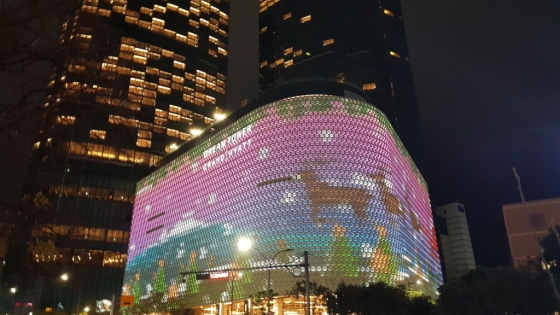 쌍둥이 빌딩 사이의 8층 빌딩 벽면에는 국내 최대규모의 대형 '미디어파사드'(가로 241, 세로 42m)로 이뤄져 밤이면 매시간 정각에 화려한 색상의 다양한 영상들이 소개된다. 눈썰매를 끄는 순록이 달리는 모습, 크리스마스트리, 불꽃놀이 등등. 지상에는 한라산의 오름 모형 분수대 5곳에서 물을 뿜는다. 주변의 불밝힌 건물들과 어우러져 이를 보노라면 서울이나 뉴욕, 홍콩 등 어느 대도시의 화려한 야경 못지 않다.