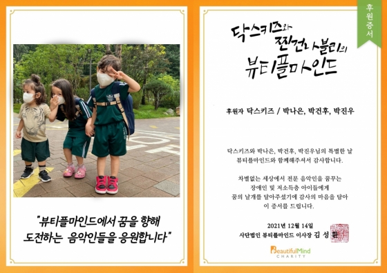 닥스키즈는 그동안 뷰티플마인드의 각종 활동을 후원해 왔다. 특히, 지난 6월과 10월에는 뷰티플마인드 최연소 작곡가 김건호(시각장애, 초5년)군과 환경 보호의 의미와 중요성을 담은 음원을 발표한 '에코오션 캠페인'을 진행했다.