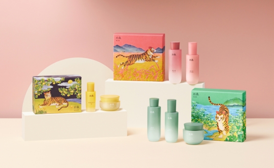 조선 후기 민화를 현대적 감성으로 풀어내는 화가 서하나의 모던민화 작품은 '어린쑥 수분진정 라인', '빨간쌀 진액 라인', '달빛유자 라인'의 베스트셀러 제품 3개와 설 명절 2종 선물세트 제품 3개에 담았다.
