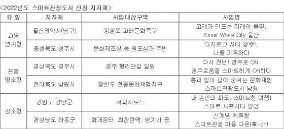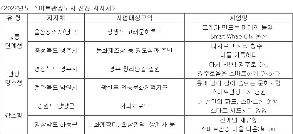 문화체육관광부(장관 황희)와 한국관광공사(사장 안영배)는 '2022 스마트관광도시 조성사업'의 대상지로 ▲경주시 ▲남원시 ▲양양군 ▲울산광역시(남구) ▲청주시 ▲하동군(가나다 순) 6곳을 최종 선정했다.