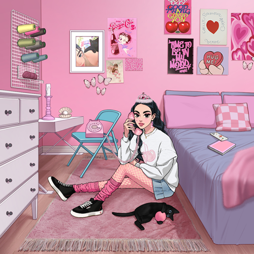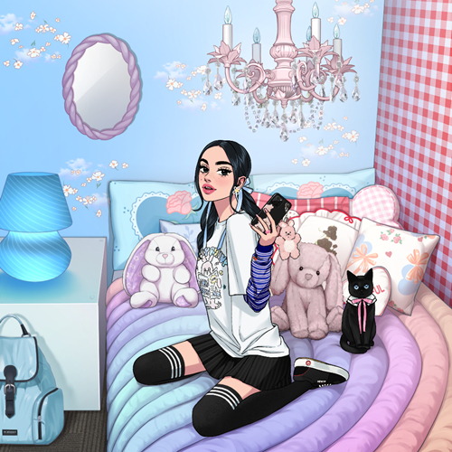 핑크 톤의 첫 번째 방에서는 키르시를 대표하는 체리 라인에 핑크 레그워머와 로우라이즈 데님 스커트를 매치한 지지를 볼 수 있다. 파스텔 민트 톤의 두 번째 방에선 유쾌한 아트웍이 새겨진 두들 체리 라인을 착용한 지지의 발랄한 면모가 돋보인다. 하늘색 톤의 세 번째 방에선 위티버니 라인의 아이템과 하늘색 리본을 매치한 지지의 소녀다운 스타일링을 확인할 수 있다.