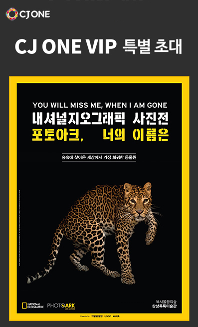 이번 이벤트는 'CJ ONE VIP DAY' 활동의 일환으로 VIP 회원 대상으로 진행되며, 사전 응모한 VIP 회원 중 1,025명을 추첨해 '지구의 날' 당일 내셔널지오그래픽 사진전 <포토 아크, 너의 이름은> 무료 관람 혜택 및 특별한 프로그램을 제공한다.