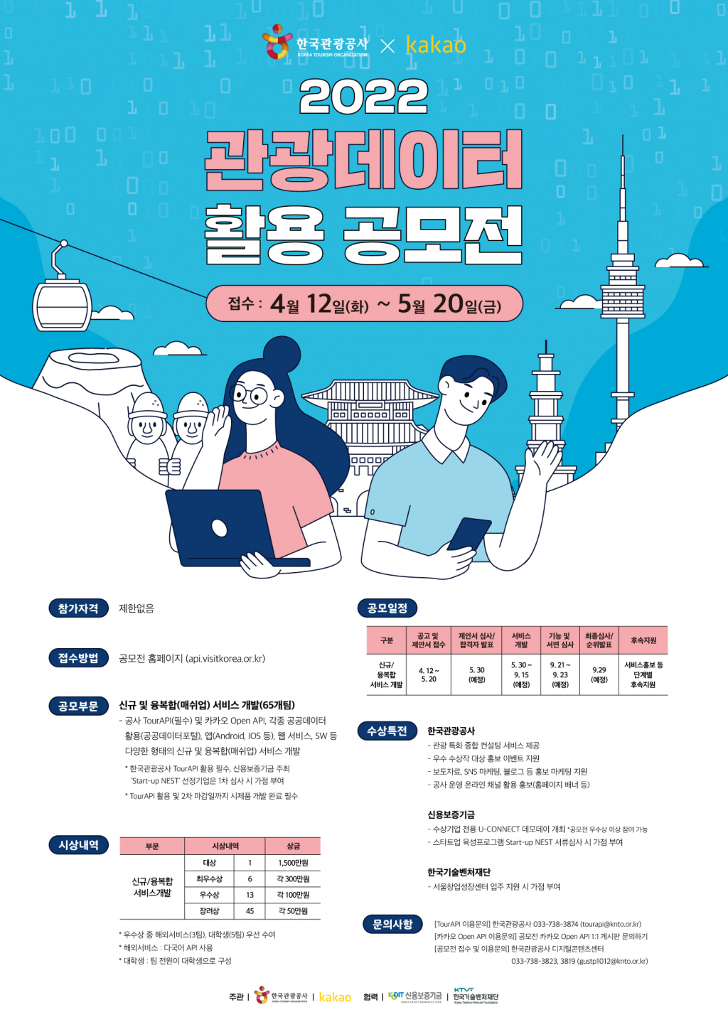 한국관광공사(사장 안영배)와 카카오(공동대표 여민수, 조수용)는 공사가 보유한 195만 여 건의 관광정보 개방 서비스 '투어 API'와 카카오의 오픈 API관광정보를 활용한 '2022 관광데이터 활용 공모전'을 4월 12일~5월 20일 개최한다.