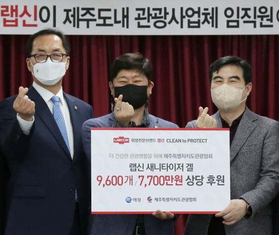 애경 '랩신'(LABCCiN)이 지난 18일 제주시에 소재한 제주종합비즈니스센터에서 '제주특별자치도관광협회(이하 제주관광협회)'에 '랩신 손소독제'를 지원하는 전달식을 진행했다.