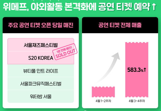 위메프 관계자는 "공연 관람 수요가 계속 이어지며 티켓 오픈을 앞둔 주요 공연들도 치열한 예매 경쟁이 예상된다"고 말했다