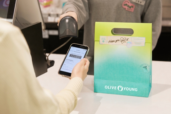 올리브영 매장을 방문한 고객이 모바일 선물 픽업(Pick-up) 서비스를 이용하고 있는 모습 /사진제공=CJ올리브영