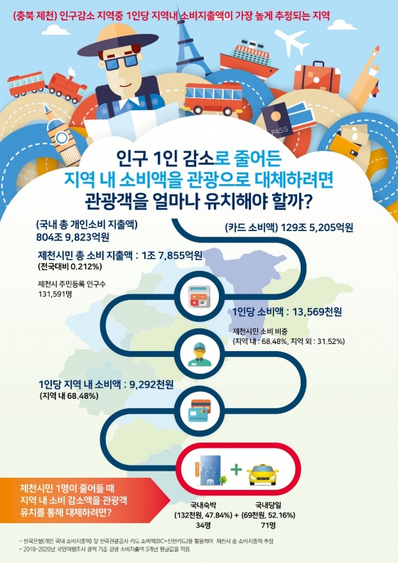 인구가 감소세인 기초지자체별 지역 내 소비지출 규모는 충북 제천(9,292천 원), 경북 안동(7,411천 원), 충남 논산(7,180천 원) 순으로 높았고, 전남 신안(2,108천 원), 전북 임실(2,672천 원), 전남 함평(2,731천 원) 순으로 낮게 나타났다. 관광 대체소비로 보면 제천은 감소인구 1명당 숙박여행 34명과 당일여행 71명, 신안은 숙박 6명과 당일 14명이 필요한 것으로 나타났다.