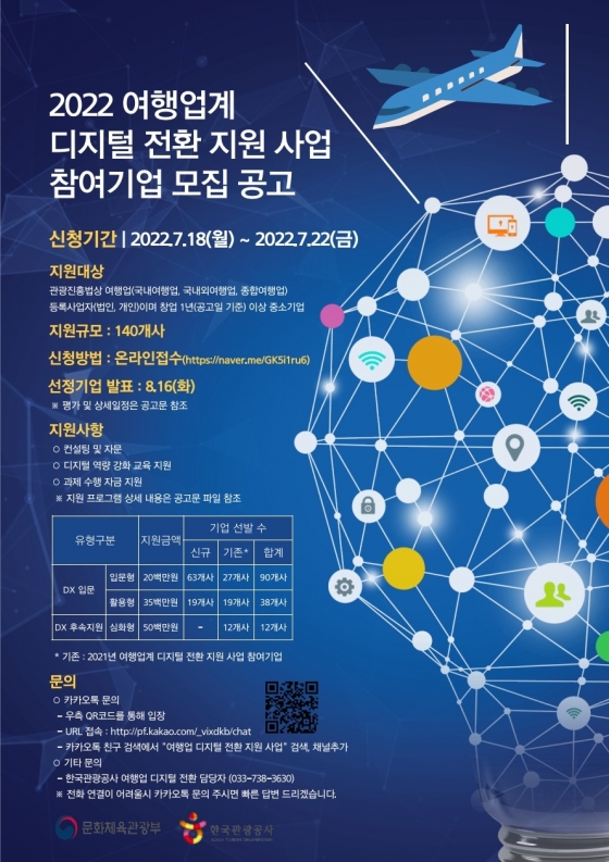 문화체육관광부(장관 박보균)와 한국관광공사(사장직무대행 신상용)는 '2022년 여행업계 디지털 전환 지원 사업'에 참여할 기업을 7월 18일부터 7월 22일까지 모집한다.