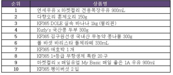 톱10 순위를 살펴보면 컬리온리 상품이 8개이며, 이 중 6개가 온라인 최저가 수준으로 판매하는 일명 최저가 도전 상품이다. 앞서 소개한 전용목장우유, 콩나물을 비롯해 KF365 애호박(7위), KF365 무항생제 특란(8위), KF365 팽이버섯(10위) 등 합리적 가격을 갖춘 컬리온리 상품이 두루 상위권에 이름을 올리며 고객 신뢰를 받고 있는 것으로 나타났다.