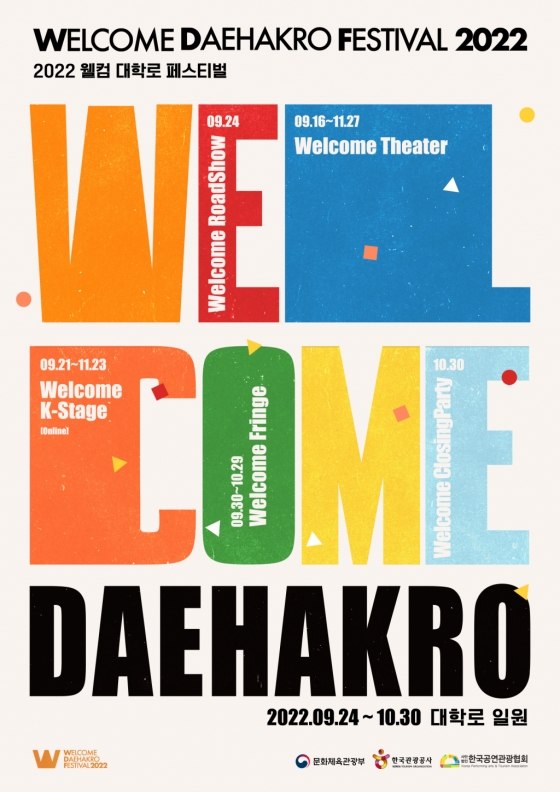 한편 본행사인 '2022 웰컴 대학로'의 공연과 콘텐츠도 더욱 풍성해졌다. 역대 가장 많은 150여 개의 작품이 참여하는 가운데 축제의 시작을 알리는 '웰컴 로드쇼'를 비롯, 대학로 거리와 공원에서 다양한 공연들을 만날 수 있는 '웰컴 프린지', 한국 연극·뮤지컬을 외국어 자막과 함께 대형 공연장에서 즐길 수 있는 '웰컴 씨어터', 글로벌 관객들이 온라인으로 공연을 즐길 수 있는 '웰컴 K-스테이지' 등 다양한 프로그램들이 마련됐다. 아울러 외국인관광객을 위한 대학로 투어, 대학로 상권 쿠폰 이벤트 등을 통해 대학로 상권의 활성화도 도모할 계획이다.