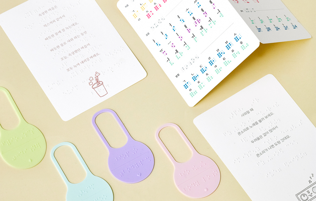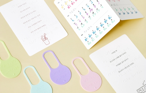 해당 제품은 실리콘 재질의 점자 태그 총 4종과 엽서 2종, 점자 일람표로 구성했다. 태그에는 각각 바디워시·바디로션·샴푸·컨디셔너를 뜻하는 점자를 한글과 영어로 표기했다. 태그 하단에는 여러 도형을 양각 표기해 제품 구분을 도와주고, 다양한 규격의 욕실 용품에 걸 수 있도록 디자인해 활용도를 높였다.