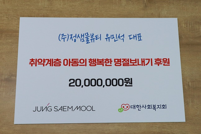 글로벌 메이크업 아티스트 브랜드 ㈜정샘물뷰티 유민석 대표가 8일 민족대명절인 추석을 맞아 도움의 손길이 필요한 아이들을 위해 대한사회복지회(회장 김석현)에 2000만원을 기부했다고 복지회가 밝혔다.