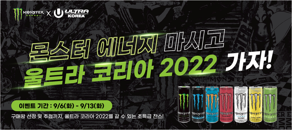 일주일 간 최다 구매 고객 상위 5명을 선정하여 울트라 코리아 2022 입장권 2매와 몬스터 에너지 음료 쿠폰 4매를, 행사 기간 내 2박스 이상 구매 확정과 리뷰 작성을 완료한 구매자 중 20명에게는 울트라 코리아 2022 입장권 2매를 증정한다.