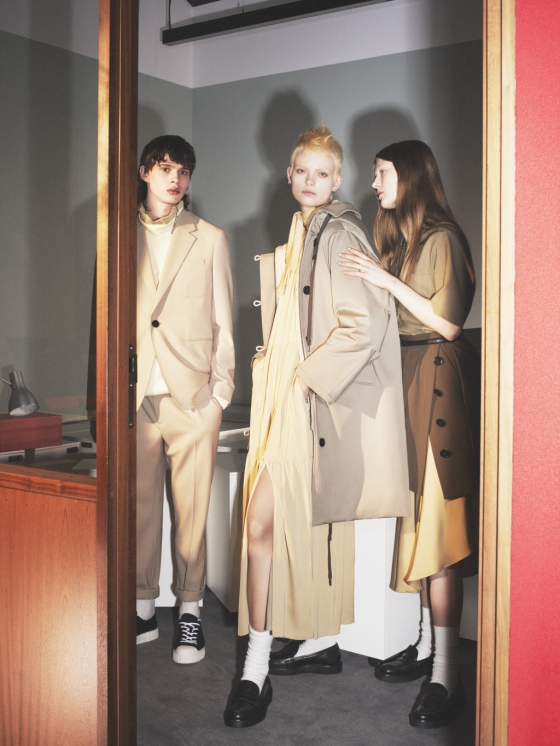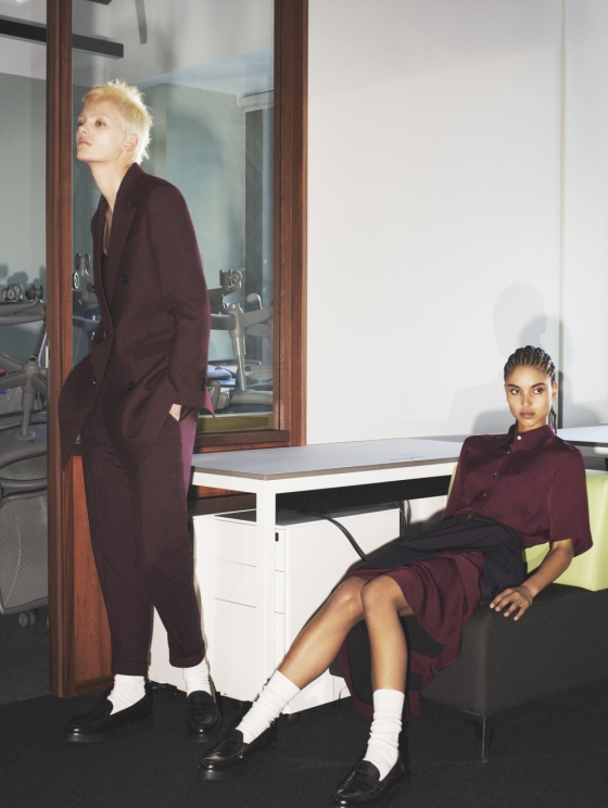 플런스 슬리브, 타이넥 탑, 타이드 실크 드레스는 캠프 셔츠와 레이어드할 수 있도록 단조로운 색감을 활용했다. 사이드 버튼이 있는 울 펜슬 스커트는 부드러운 벨벳 드레스와 레이어링했고, 네오프렌 신발혀(신발끈 밑 발등을 덮는 부분)가 특징인 시그니처 페니 로퍼와 함께 스타일링했다.