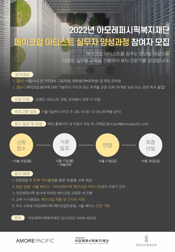 아모레퍼시픽복지재단(이사장 김승환)이 아모레퍼시픽 메이크업프로팀, 청담 살롱 '서울베이스'와 함께 주관하는 '메이크업 아티스트 실무자 양성과정'의 참여자를 내달 10일까지 모집한다고 19일 밝혔다.