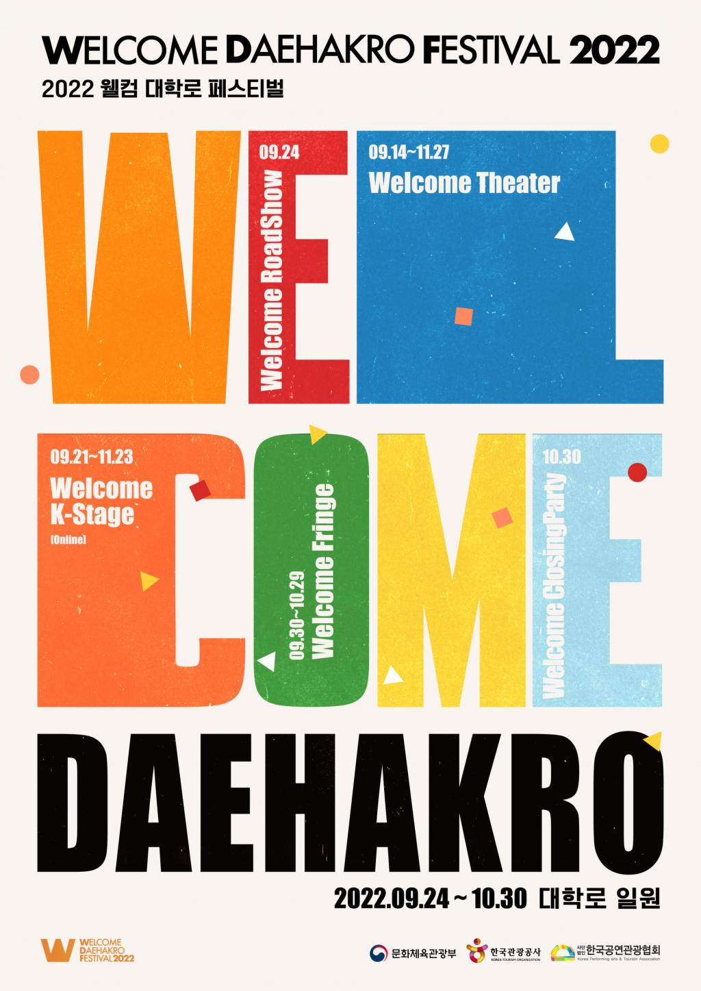 문화체육관광부(장관 박보균)가 주최하고 한국관광공사(사장직무대행 신상용)와 (사)한국공연관광협회(회장 김경훈)가 공동주관하는 '2022 웰컴 대학로'가 오는 9월 24일 개막해 10월 30일까지 대학로 일대에서 개최된다.