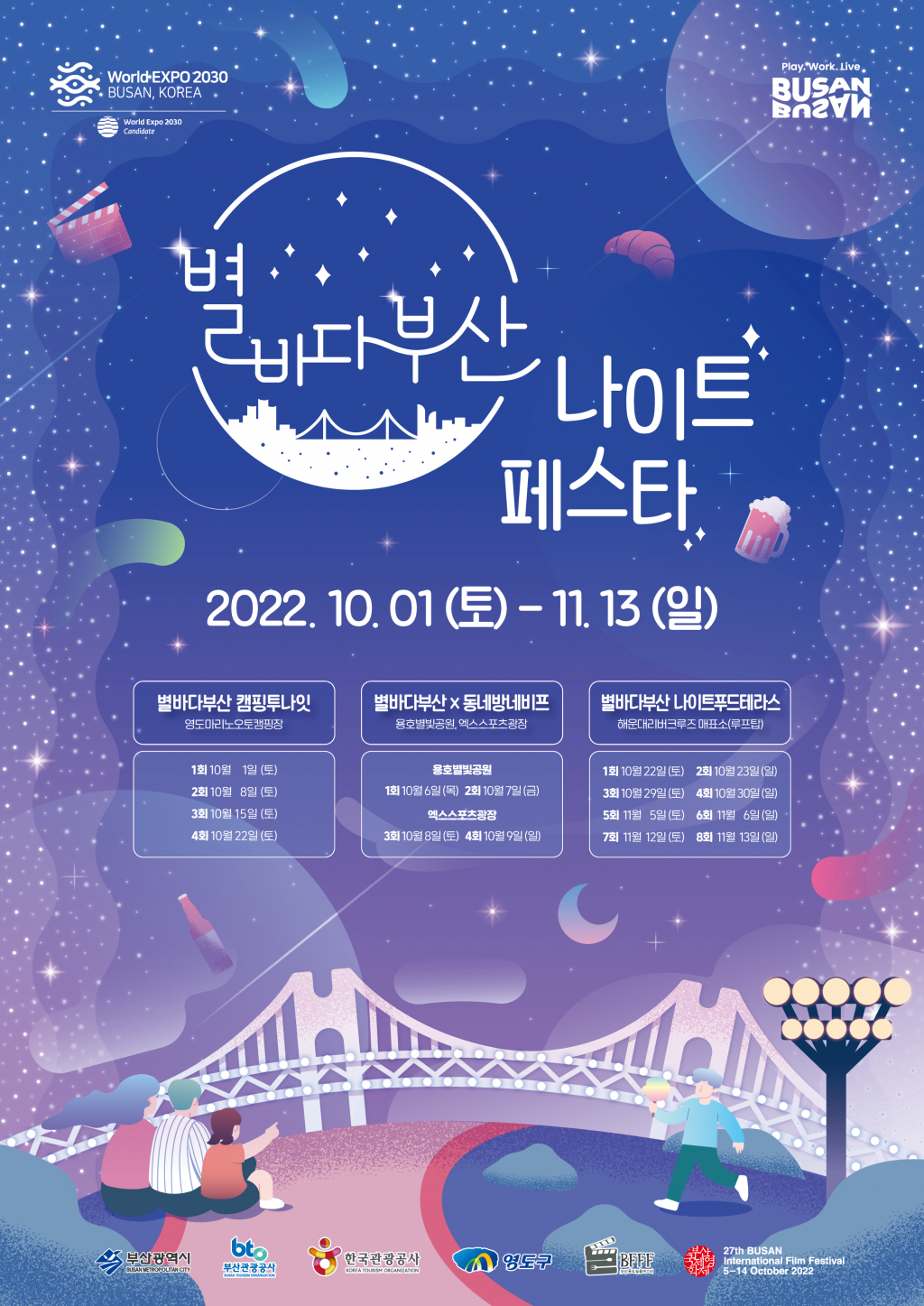 한국관광공사(사장직무대행 신상용, 이하 공사)는 부산광역시(시장 박형준, 이하 부산시)와 공동으로 국내외 관광객에게 새로운 야간관광 경험을 제공하고 지역관광을 활성화하기 위해 10월 1일부터 11월 13일까지 부산 영도구, 남구, 해운대구 일원에서 '제 1회 별바다부산 나이트페스타'를 개최한다.
