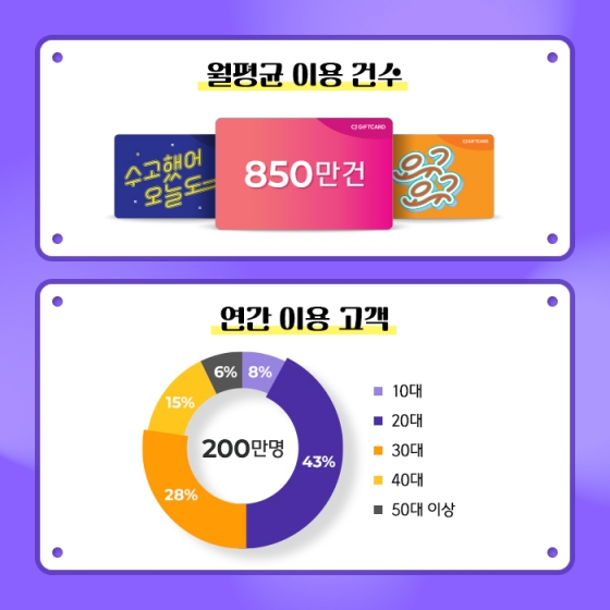 고객 이용 트렌드를 살펴보면, CJ기프트카드를 이용하는 고객은 연간 200만 명 이상으로, 그 중에서도 MZ 세대가 71%로 높은 비중을 차지한다. 세대별로 보면 20대(43%), 30대(28%), 40대(15%), 10대(8%), 50대 이상(6%) 순으로 활발하게 사용하는 모습을 보였다.