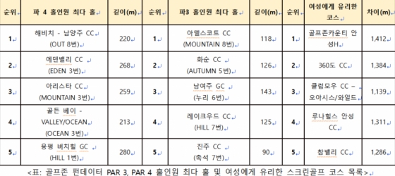챔피언 티 기준으로 최장, 최단 전장길이의 코스 정보도 확인 가능하다. 최장 전장거리 보유 코스는 1위부터 5위까지 인터불고 경산CC(SKY, MOUNTAIN), 클럽디금강, 아크로CC, 라싸CC(MOUNTAIN, LAKE), 파인리즈CC(RIDGE, LAKE) 순이며, 최단 전장거리 보유 코스는 골프존카운티 구미, 에머슨골프클럽, 골프존카운티 안성W, 프린세스GC, 더골프클럽 순이다. 프런트티와 레이디티의 전장 길이 차이를 기준으로 한 여성 골퍼에게 유리한 코스 정보도 흥미롭다. 1위로는 전장길이 1,412m의 골프존카운티 안성H가 꼽혔으며 360도CC, 클럽모우CC(오아시스, 와일드), 루나힐스 안성CC, 참밸리CC 순이다.