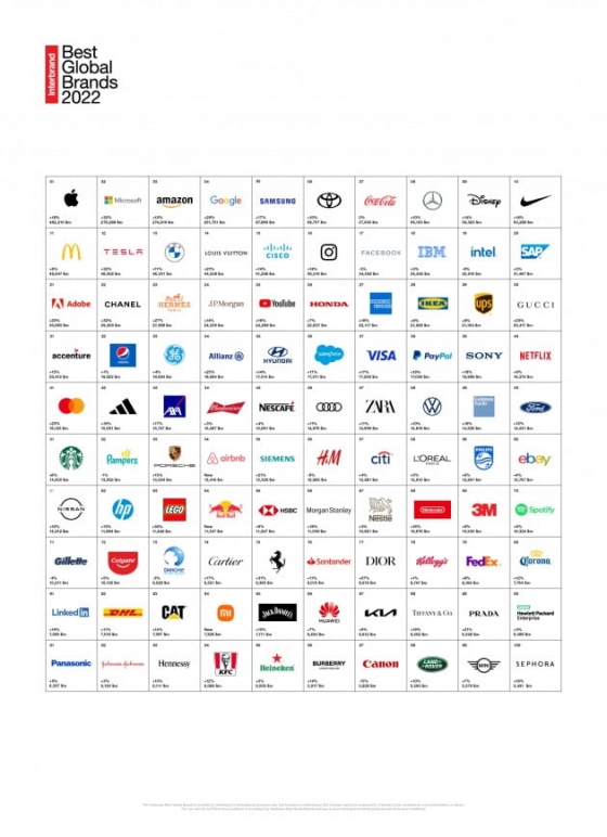 글로벌 브랜드 컨설팅 그룹 인터브랜드가 이 같은 내용의 '2022년 베스트 글로벌 브랜드 순위'를 발표했다. 영예의 1위는 애플이며 10년 연속 1위 자리를 지키고 있으며, 마이크로소프트가 아마존을 제치고 2위에 올라섰다.