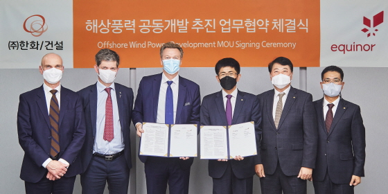 ㈜한화 건설부문이 7일 서울 장교동 한화빌딩에서 노르웨이 국영 에너지기업인 에퀴노르와 국내 해상풍력 공동개발 추진을 위한 업무협약을 체결했다.