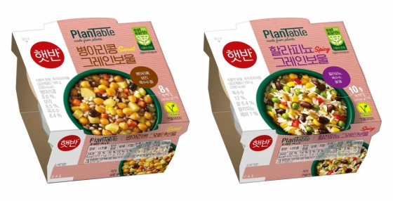 '햇반 플랜테이블 그레인보울'은 '병아리콩 그레인보울'과 '할라피뇨 그레인보울'의 2종으로 출시됐다. '병아리콩 그레인보울'은 병아리콩, 고구마, 옥수수, 보리 등 각종 곡물 재료를 원물 그대로 담아 담백한 맛이 특징이다. '할라피뇨 그레인보울'은 멕시칸 음식에서 자주 접할 수 있는 검정강낭콩, 할라피뇨 등이 들어있어 보다 이색적인 맛과 향으로 즐길 수 있다.