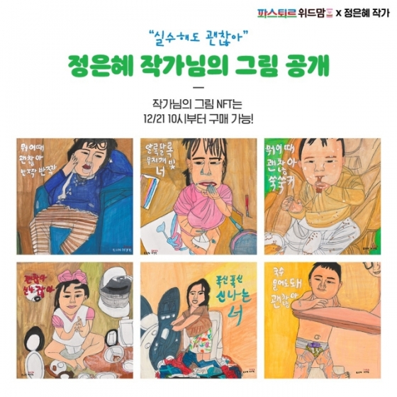 실수해도 괜찮아 디지털 아트 프로젝트는 아이들과 엄마들을 응원하는 일환으로 기획됐다. 살면서 다양하고 귀여운 실수를 하는 아이들의 사연과 사진을 응모 받아 정은혜 작가와 함께 NFT 아트워크로 재탄생시켰다. '물감 샤워도 괜찮아'·'온 몸으로 먹어도 괜찮아' 등 총 6종 NFT 작품에는 정은혜 작가만의 짧지만 힘있는 힐링메시지도 담겨 있다.