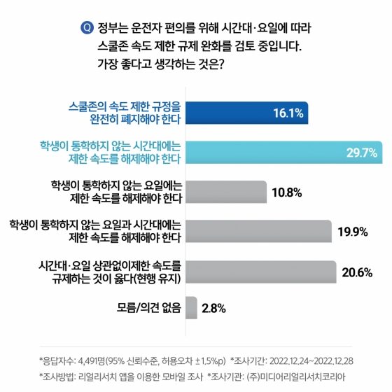 운전자 편의를 위해 정부의 시간 및 요일에 따른 스쿨존 속도 제한 규제 완화에 대해 '학생이 통학하지 않는 시간대는 제한속도를 해제해야 한다(29.7%)'가 가장 높았으며 ▲'현행 제한속도 규제를 유지하는 것이 옳다(20.6%) ▲'학생이 통학하지 않는 요일과 시간대에는 제한 속도를 해제애야 한다(19.9%) 순으로 집계됐다.