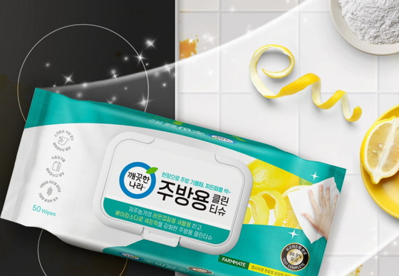 '깨끗한나라 주방용 클린티슈'는 도톰한 에어엠보싱 원단을 사용해 표면의 스크래치 걱정 없이 사용 가능하다. 레몬껍질 원료와 베이킹소다 및 곡물발효 에탄올이 함유돼 있어 기름때와 찌든 때, 물 얼룩 제거에도 효과적이다.
