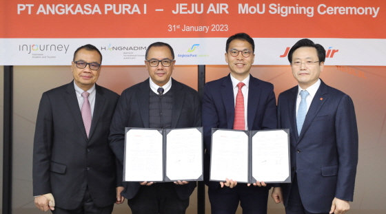 제주항공과 인도네시아 제1공항공사는 1월31일 오전 서울 강서구 제주항공 서울지사에서 김이배 제주항공 대표이사와 에드윈 이다야트 압둘라 인도네시아 관광지주회사 부사장, 파익 파미 AP1 대표이사 등이 참석한 가운데 '양국 간 노선 개발 및 신규 협력 사업 발굴을 위한 업무협약'을 체결했다.
