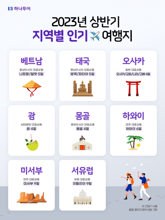 지역별 하나투어 대표 상품으로 ▲여러 예능 프로그램을 통해 미식 여행지로 주목받는 베트남 나트랑/달랏 5일, 방콕/파타야 5일 ▲일본 여행 개방 이후 꾸준히 인기 여행지로 사랑받는 오사카/교토/나라/고베 4일 ▲별이 쏟아지는 은하수 인증샷이 SNS상에서 화제가 되어 MZ세대에게 주목받는 몽골 4일 ▲22년 하반기부터 23년까지 아동 동반 예약률 상위 차지하고 있는 괌 4일 ▲코로나 이전부터 미주 지역 베스트셀러인 하와이 6일 및 미서부 9일 ▲23년 상반기 출발 예약 인원 가장 많은 이탈리아 9일 등이 있다.