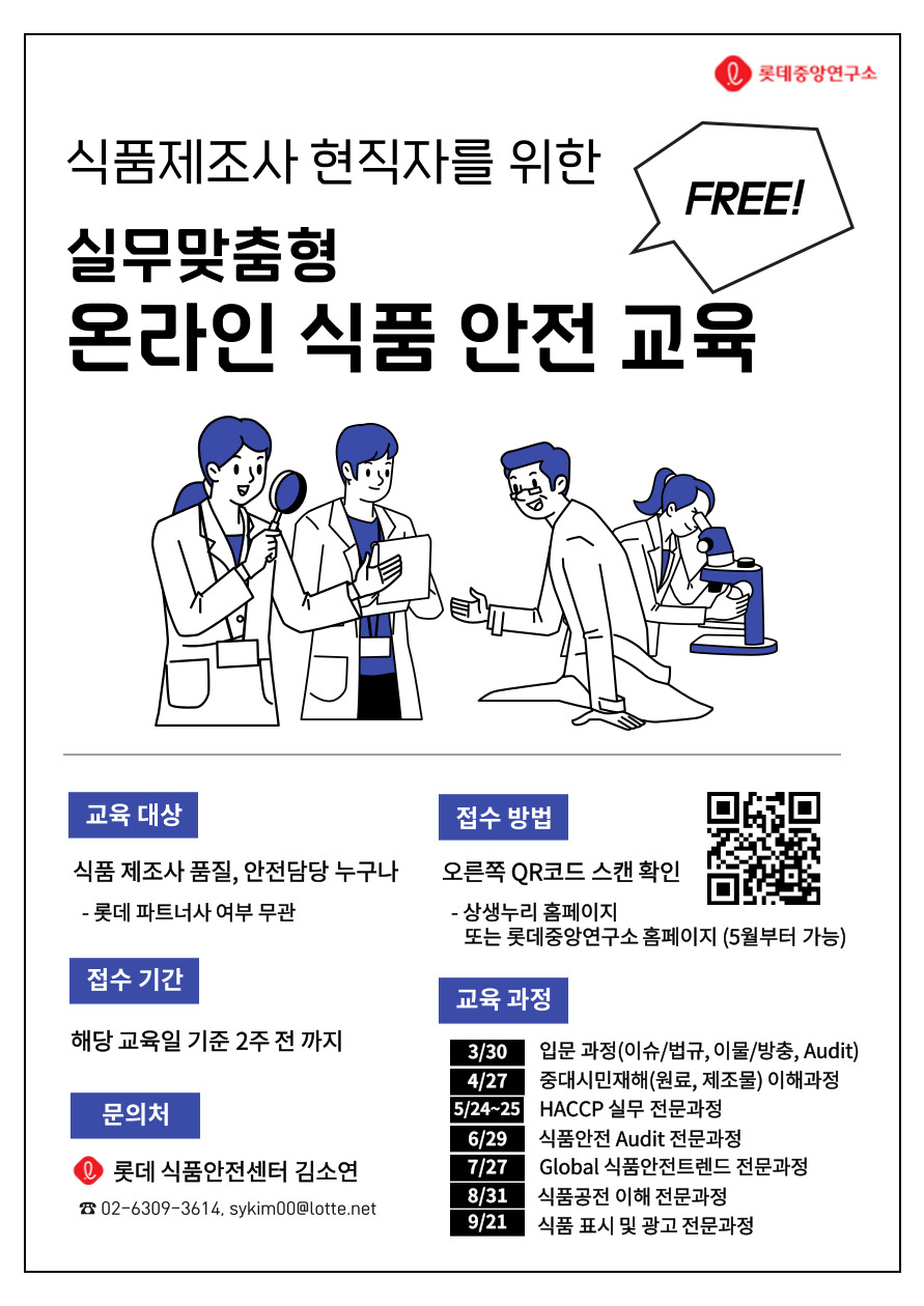 교육 신청 접수는 상생누리 및 오는 4월 말 리뉴얼 오픈 예정인 롯데중앙연구소 홈페이지에서 가능하며, 자세한 내용은 홍보 포스터의 QR코드 스캔을 통해 확인할 수 있다.