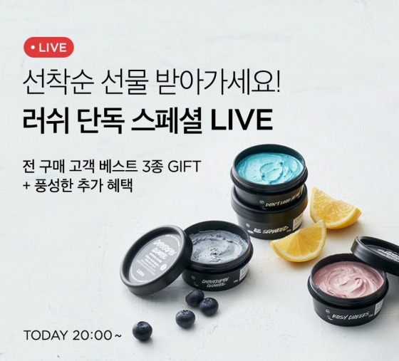 이번 라방에서는 프레쉬 마스크팩 5종과 슬리피 샤워 젤, 보디 로션 등을 준비했다. 상품을 구매한 모든 고객에게는 러쉬의 스마트 샘플 3종을 제공하며, 세트 구성을 구매한 고객에게는 랜덤으로 깜짝 선물도 증정한다.