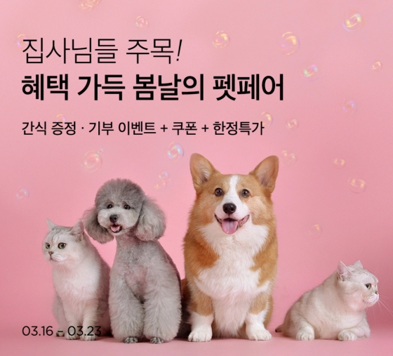 '봄날의 펫페어' 기획전은 사료, 간식, 펫캉스 숙박권, 각종 용품 등 700여 가지 반려동물 상품을 한데 모았다. 기획전 기간에만 구매할 수 있는 한정특가 상품도 판매한다. 어글어글 제주 친환경 당근 우유껌은 45% 저렴한 가격에 구매 가능하고 닭가슴살 위에 병아리콩 크럼블, 단호박 소스를 곁들인 페피밀 갓치킨, 듀먼 자연화식 등은 특가로 선보인다.