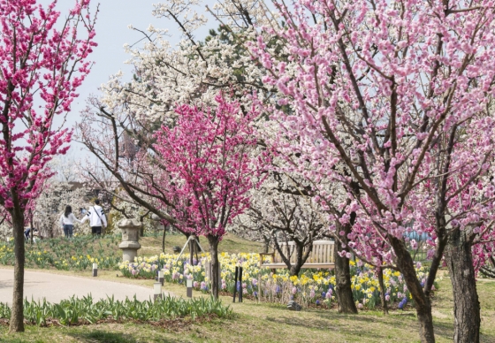 콜럼버스대탐험 뒤편 약 3만3천㎡ 부지에 조성된 하늘정원길에는 만첩매, 율곡매, 용유매 등 11종 700여 그루의 매화나무 뿐만 아니라 다양한 수목과 봄꽃들까지 웅장하게 어우러져 봄 나들이 장소로 그만이다.