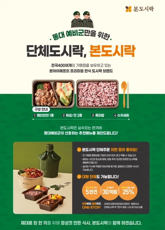 본도시락 관계자는 "일상을 잠시 미뤄두고 훈련에 참가하는 예비군들에게 맛과 영양, 속까지든든한 집밥 같은 도시락을 공급하고자 '예비군 도시락'을 단체 접수 및 공급하게 됐다"라며, "본사의 B2B 제휴 및 납품 운영 노하우와 전국 430여 가맹점이 연계한 안정적인 공급 서비스로, 잘 차린 식사를 제공할 계획이다"라고 말했다.