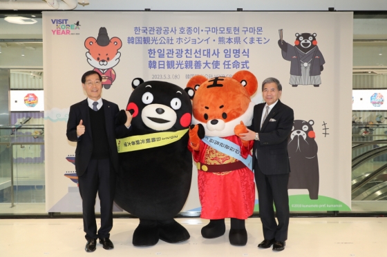 한국관광공사(이하 공사)와 일본 구마모토현은 5월 3일 서울 하이커그라운드에서 한국관광 대표 홍보캐릭터 '호종이'와 일본 대표 캐릭터 '구마몬'을 한일관광 친선대사로 임명하는 한일 관광협력 증진을 위한 업무협약을 체결했다.