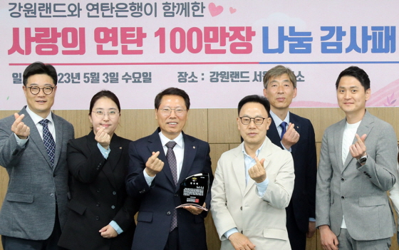 강원랜드가 전국 에너지 취약계층 8만여 가구를 위해 생존의 연탄 100만 장을 후원한 공로를 인정받아 사회복지법인 '밥상공동체 연탄은행으로부터 감사패를 받았다.
