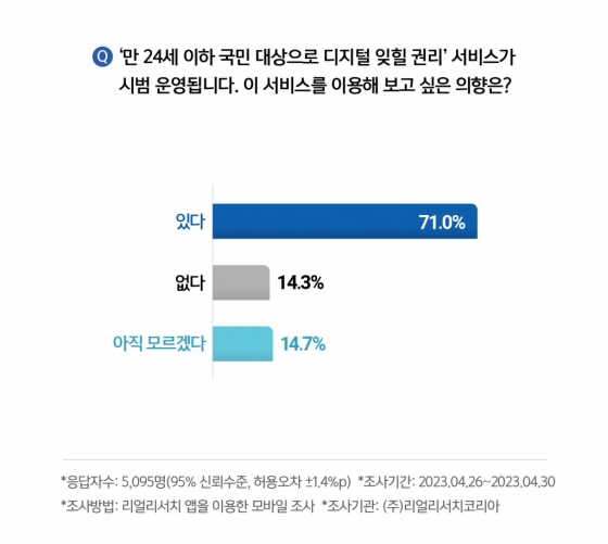 리서치 전문 기업 리얼리서치코리아가 4월 26일부터 30일까지 대한민국 성인남녀 5,095명을 대상으로 '디지털 잊힐 권리'와 관련한 설문조사를 실시했다. 결과에 따르면 71.0%의 응답자가 해당 서비스의 시범운영에 대해 '이용할 의사가 있다'라고 답한 것으로 나타났다.