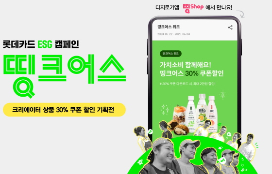 롯데카드가 디지로카앱 띵샵에서 ESG 캠페인 '띵크어스'에 참여 중인 지역 업체, 작가 판매 상품을 30% 할인해주는 기획전을 6월 4일까지 진행한다.