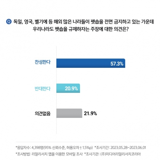 또한 독일, 영국, 벨기에 등 해외 많은 나라들이 펫숍을 전면 금지하고 있는 가운데 우리나라도 펫숍을 규제하자는 주장이 제기되고 있다. 이에 대한 의견을 묻는 질문에 '찬성한다'가 57.3%로 '반대한다(20.9%)'보다 36.4%p 높은 것으로 나타났다. 이어 '의견 없음'이 21.9%로 과반수 이상의 응답자가 펫숍 규제에 대해 찬성하고 있는 것으로 조사됐다.